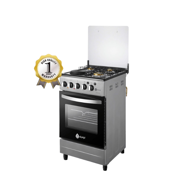 The Nunix 50×55 Standing Cooker (KZ-560-3G1E) is a compact, versatile kitchen appliance featuring 3 gas burners and 1 electric hotplate, with a built-in electric oven, ideal for smaller kitchens, offering flexibility with gas/electric cooking and baking/roasting functions, often with features like manual ignition, timer, rotisserie, and durable finish, available from Kenyan retailers